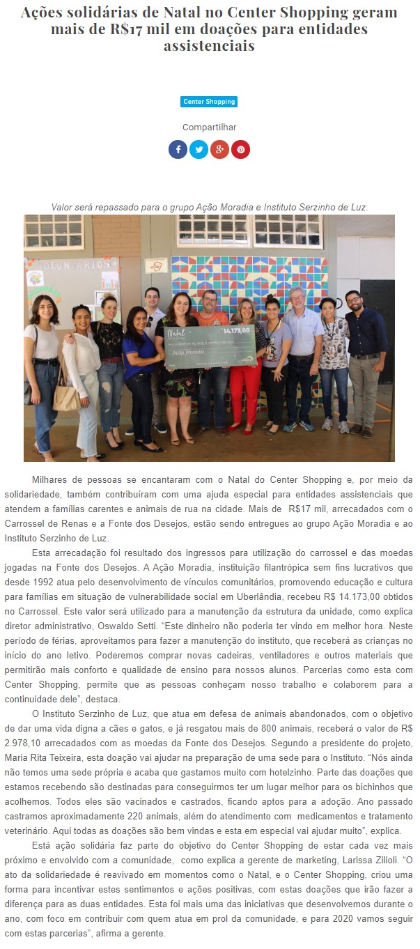 ONLINE - Ações solidárias de Natal no Center Shopping geram mais de R$17 mil em doações para entidades assistenciais - 17/01