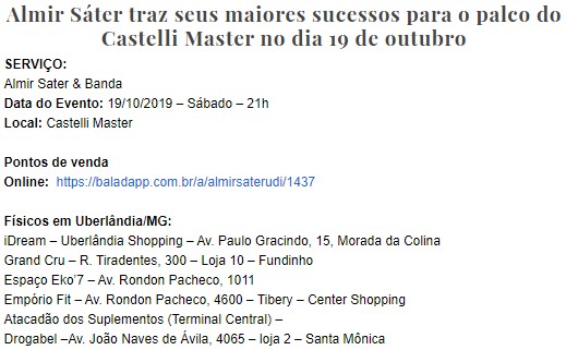 ONLINE - Almir Sáter traz seus maiores sucessos para o palco do Castelli Master no dia 19 de outubro - PONTO DE VENDAS (01/10)
