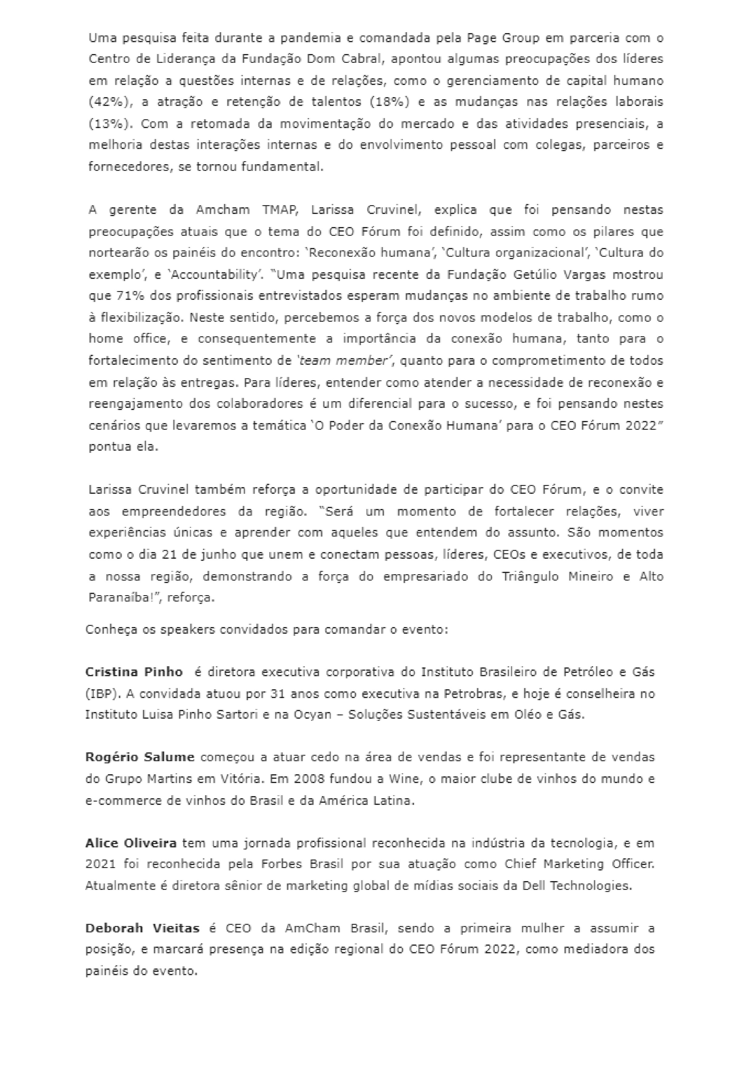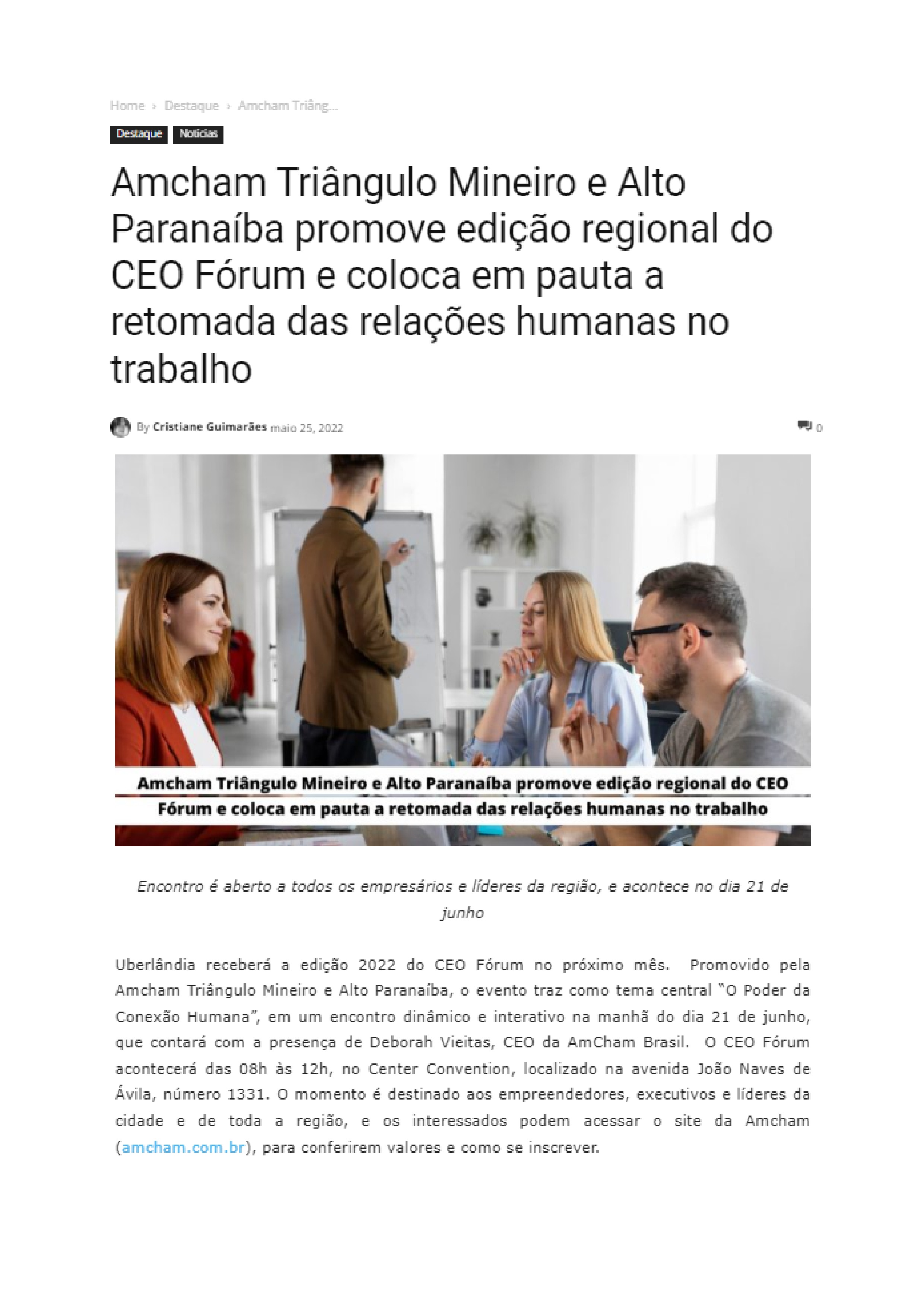 ONLINE - Amcham Triângulo Mineiro e Alto Paranaíba promove edição regional do CEO Fórum e coloca em pauta a retomada das relações humanas no trabalho