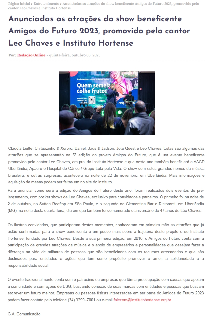 ONLINE - Anunciadas as atrações do show beneficente Amigos do Futuro 2023, promovido pelo cantor Leo Chaves e Instituto Hortense - 05.10