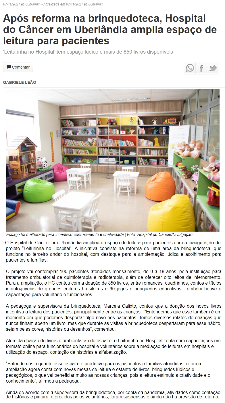 ONLINE-Após reforma na brinquedoteca. Hospital do Câncer em Uberlândia amplia espaço de leitura para pacientes - 07.11