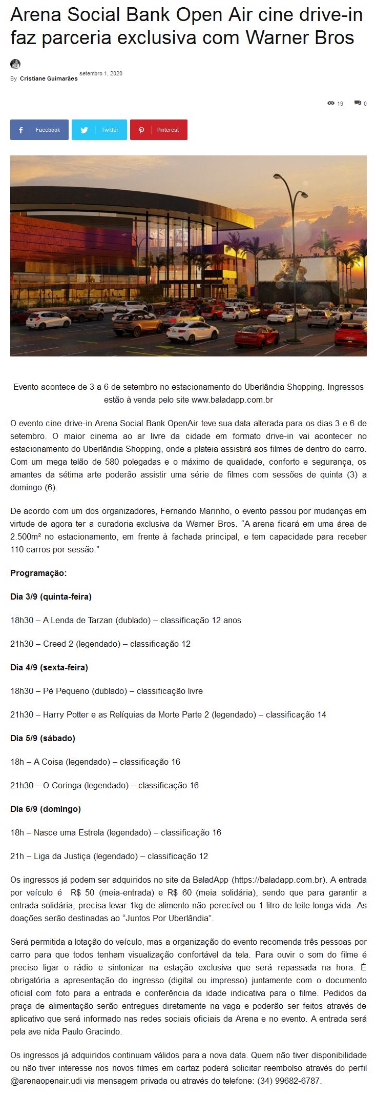ONLINE - Arena Social Bank Open Air cine drive-in faz parceria exclusiva com Warner Bros - Patrocínio Social Bank - 02/09