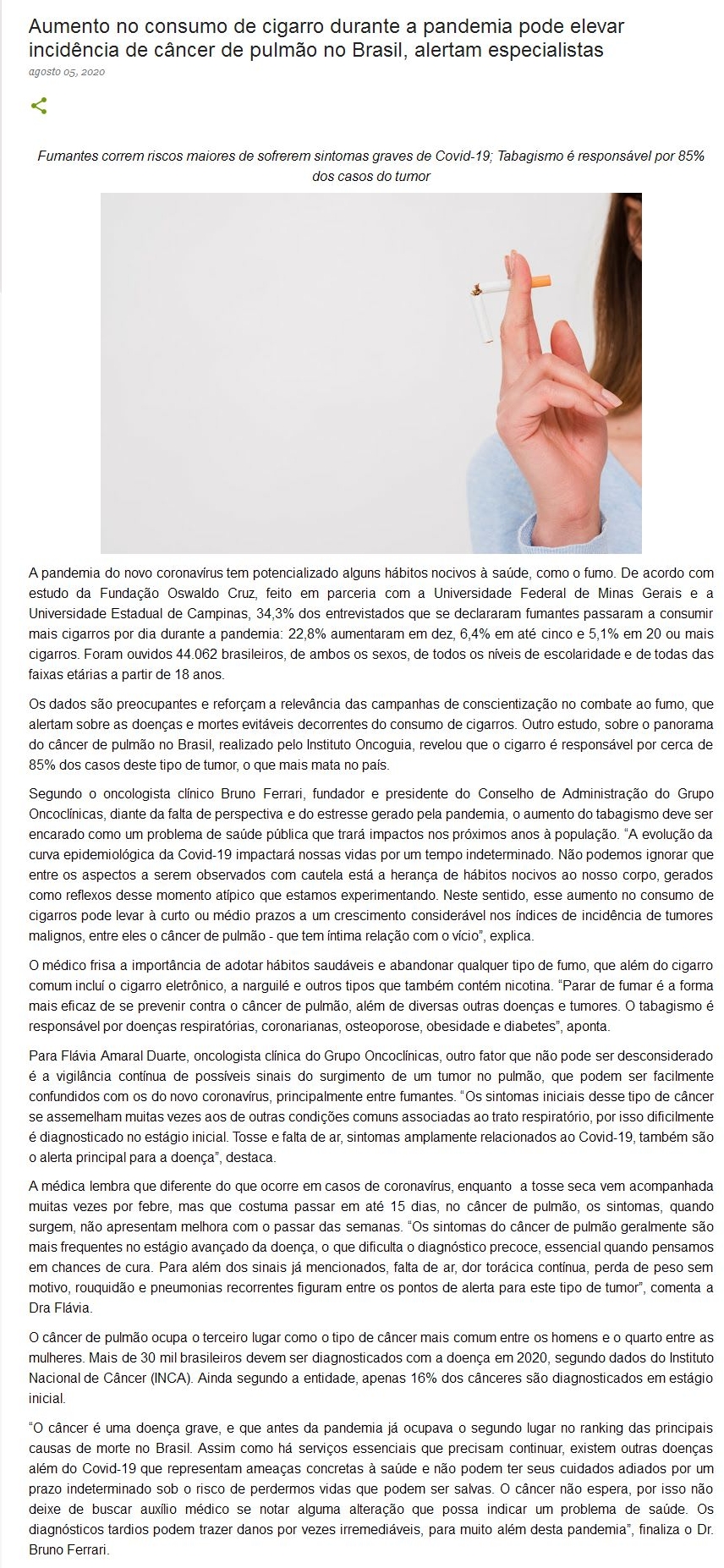 ONLINE - Aumento no consumo de cigarro durante a pandemia pode elevar incidência de câncer de pulmão no Brasil, alertam especialistas - 05/08