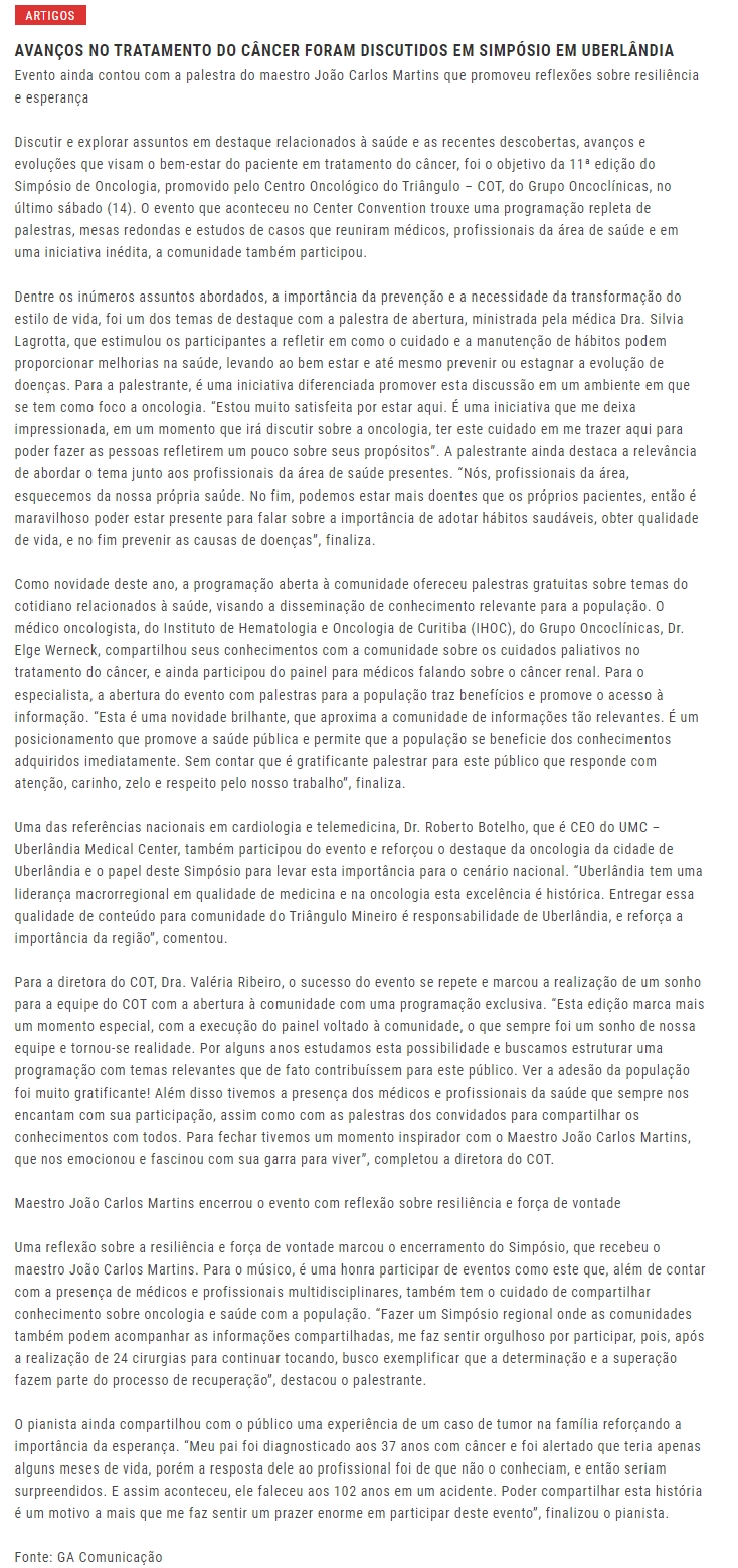 ONLINE - Avanços no tratamento do câncer foram discutidos em Simpósio em Uberlândia - COT - (20/09)