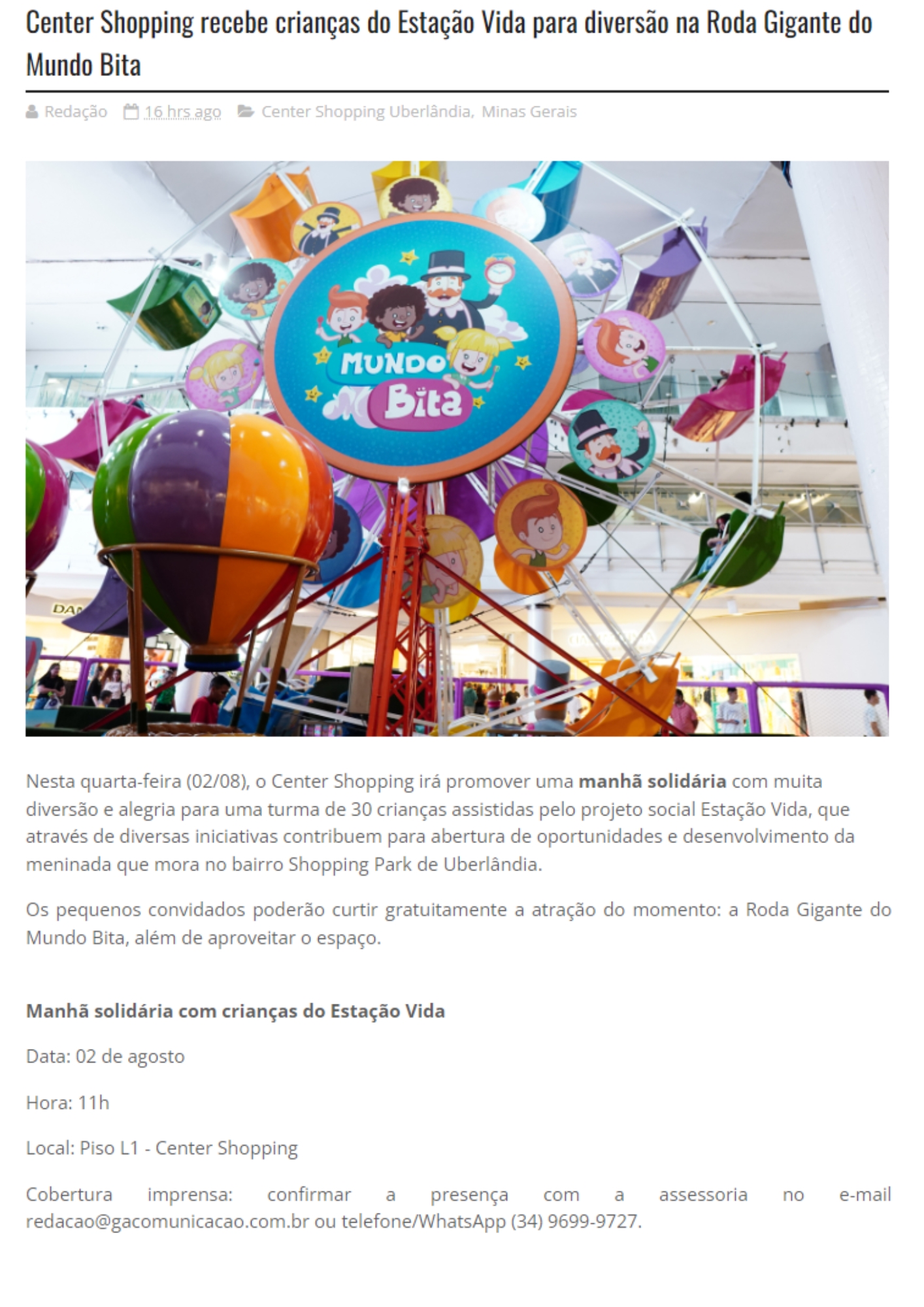 ONLINE - Aviso de Pauta: Center Shopping recebe crianças do Estação Vida para diversão na Roda Gigante do Mundo Bita - 01.08