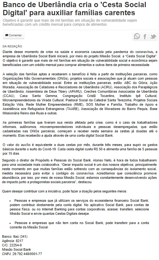 ONLINE - Banco de Uberlândia cria o 'Cesta Social Digital' para auxiliar famílias carentes - 16/04