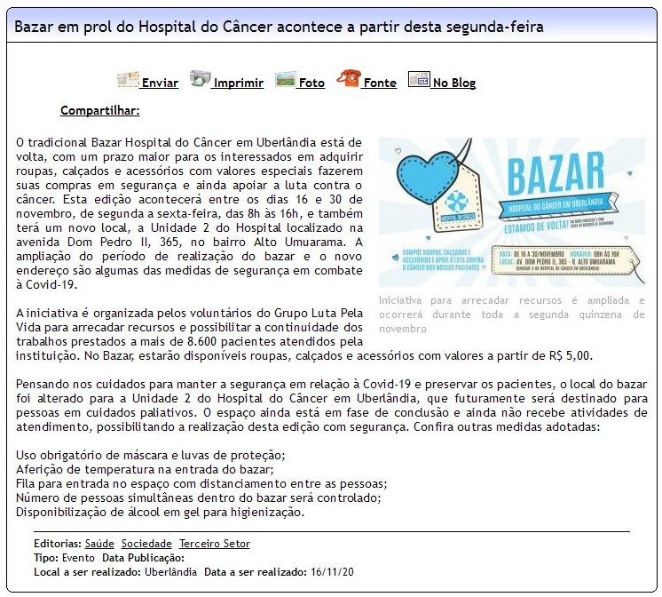 ONLINE - Bazar em prol do Hospital do Cāncer acontece a partir desta segunda-feira - 13/11