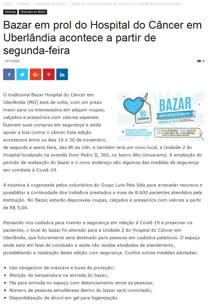 ONLINE - Bazar em prol do Hospital do Cāncer em Uberlāndia acontece a partir de segunda-feira - 12/11