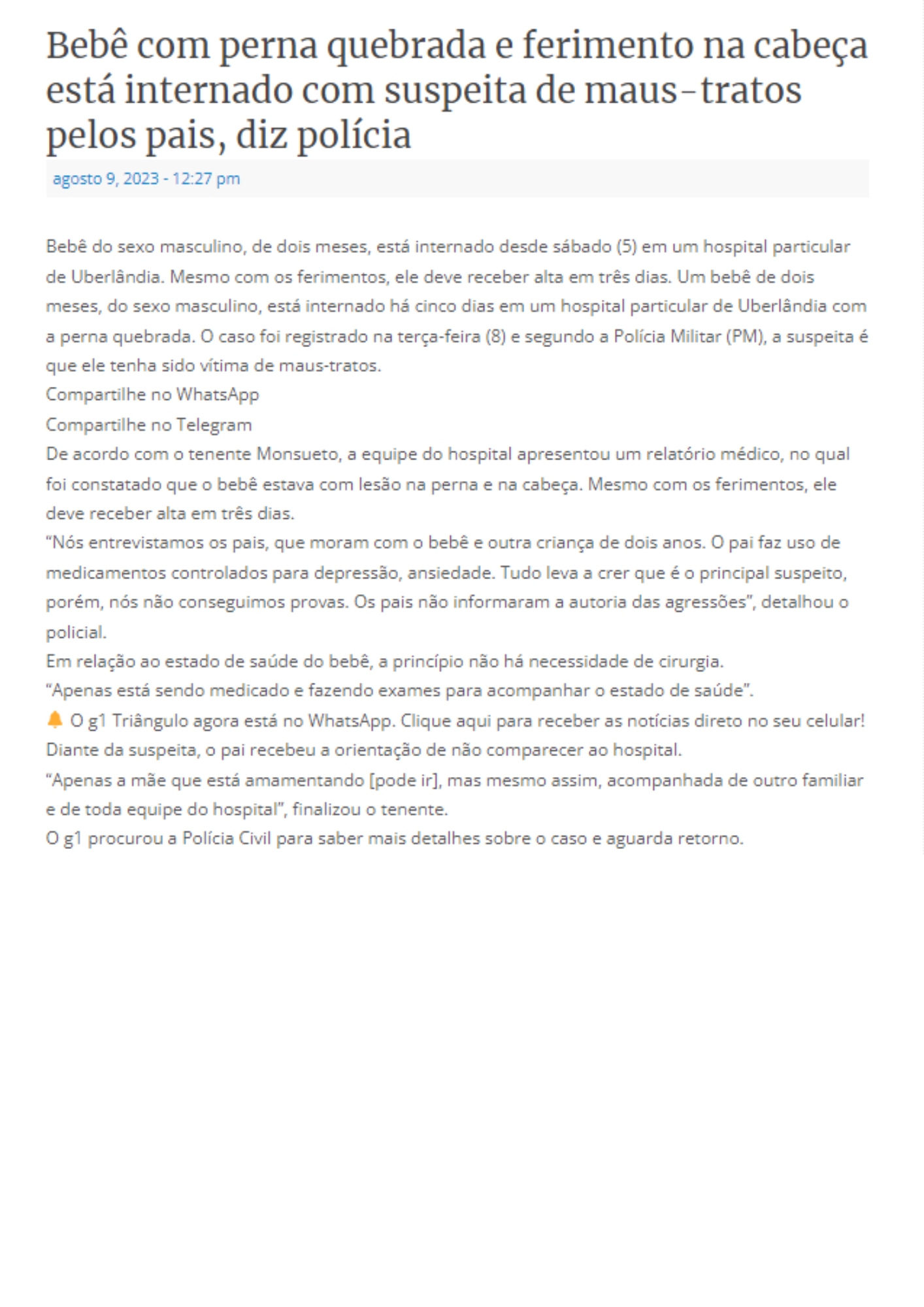 ONLINE - Bebê com perna quebrada e ferimento na cabeça está internado com suspeita de maus-tratos pelos pais, diz polícia - 09.08