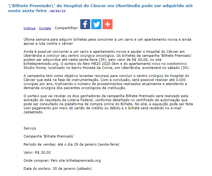 ONLINE - 'Bilhete Premiado' do Hospital do Câncer em Uberlândia pode ser adquirido até nesta sexta-feira - 26/01