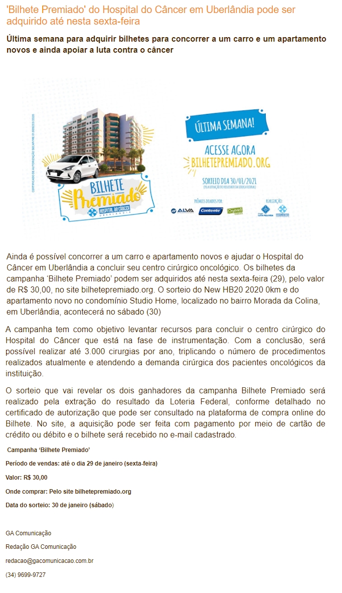 ONLINE - 'Bilhete Premiado' do Hospital do Câncer em Uberlândia pode ser adquirido até nesta sexta-feira - 28/01