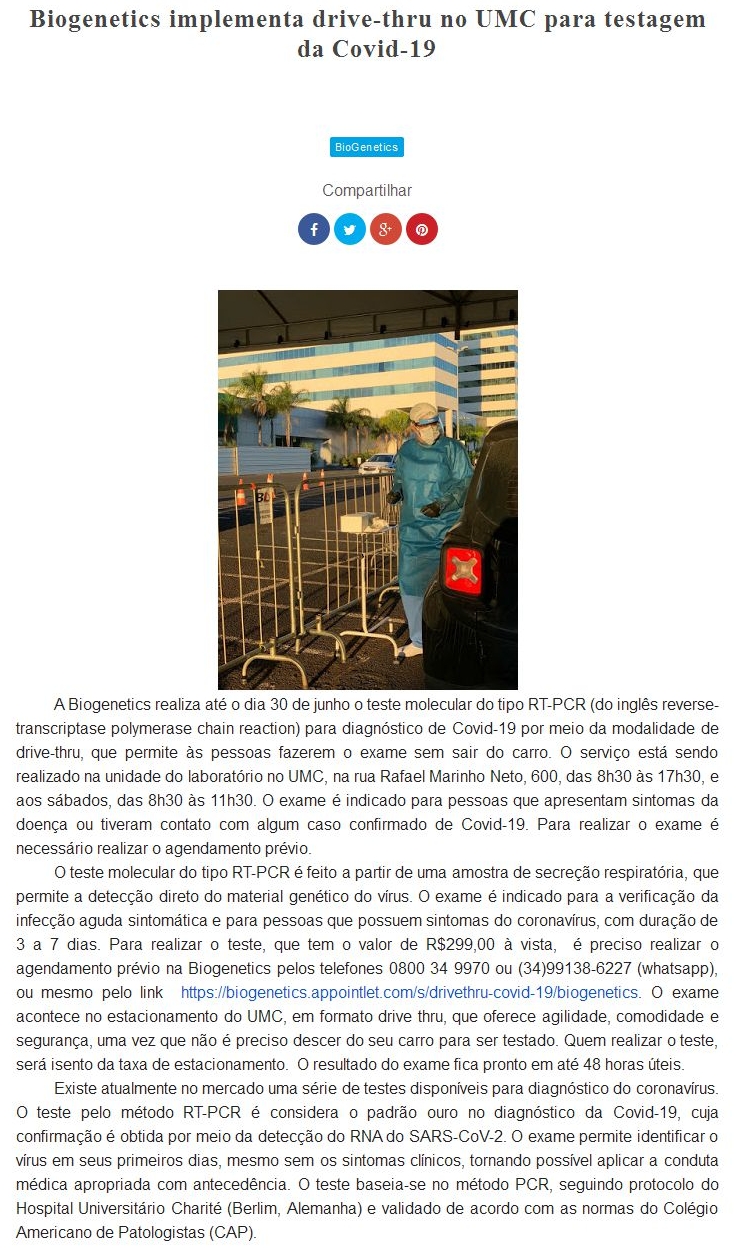 ONLINE - Biogenetics implementa drive-thru no UMC para testagem da Covid-19 - 26/05