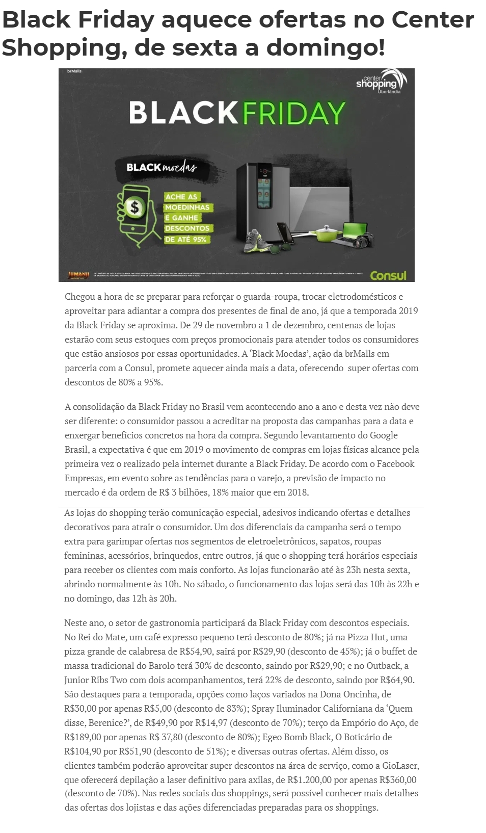 ONLINE - Black Friday aquece ofertas no Center Shopping, de sexta a domingo - (26/11)