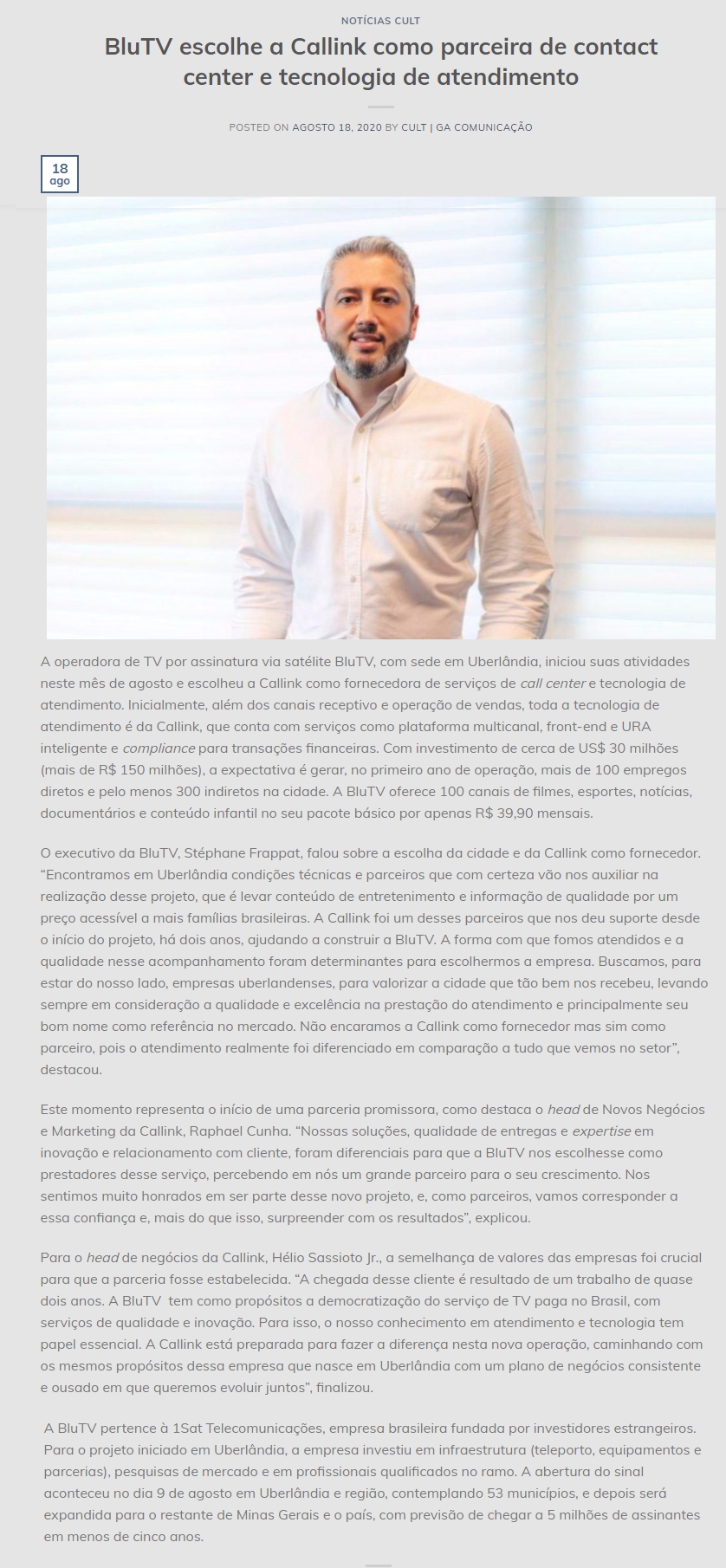 ONLINE - BluTV escolhe a Callink como parceira de contact center e tecnologia de atendimento - (18/08)