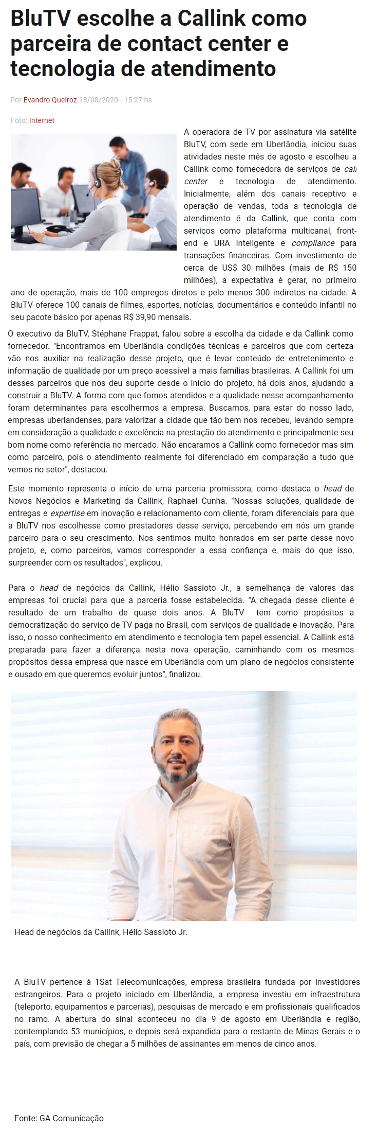 ONLINE - BluTV escolhe a Callink como parceira de contact center e tecnologia de atendimento - (18/08)