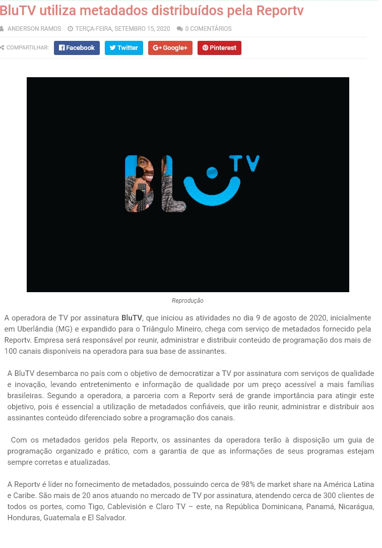 ONLINE - BluTV utiliza metadados distribuídos pela Reportv - 15/09