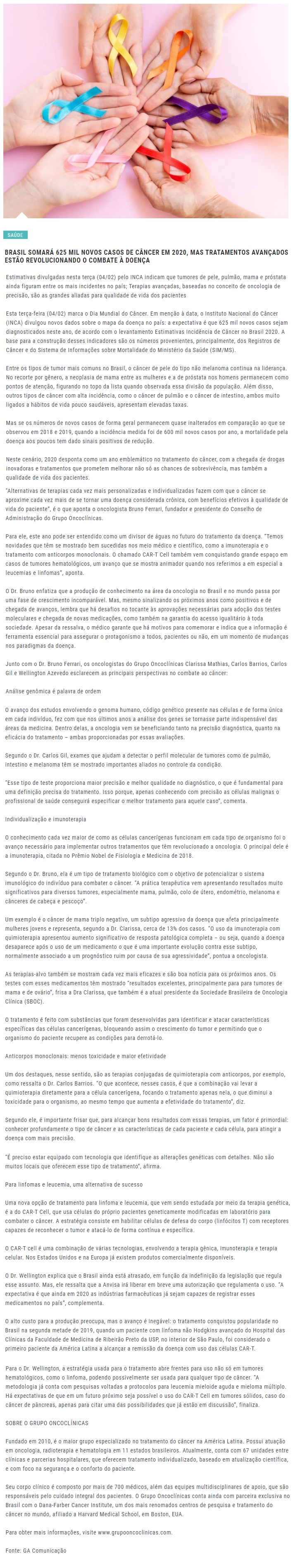 ONLINE - Brasil somará 625 mil novos casos de câncer em 2020, mas tratamentos avançados estão revolucionando o combate à doença - (06/02)