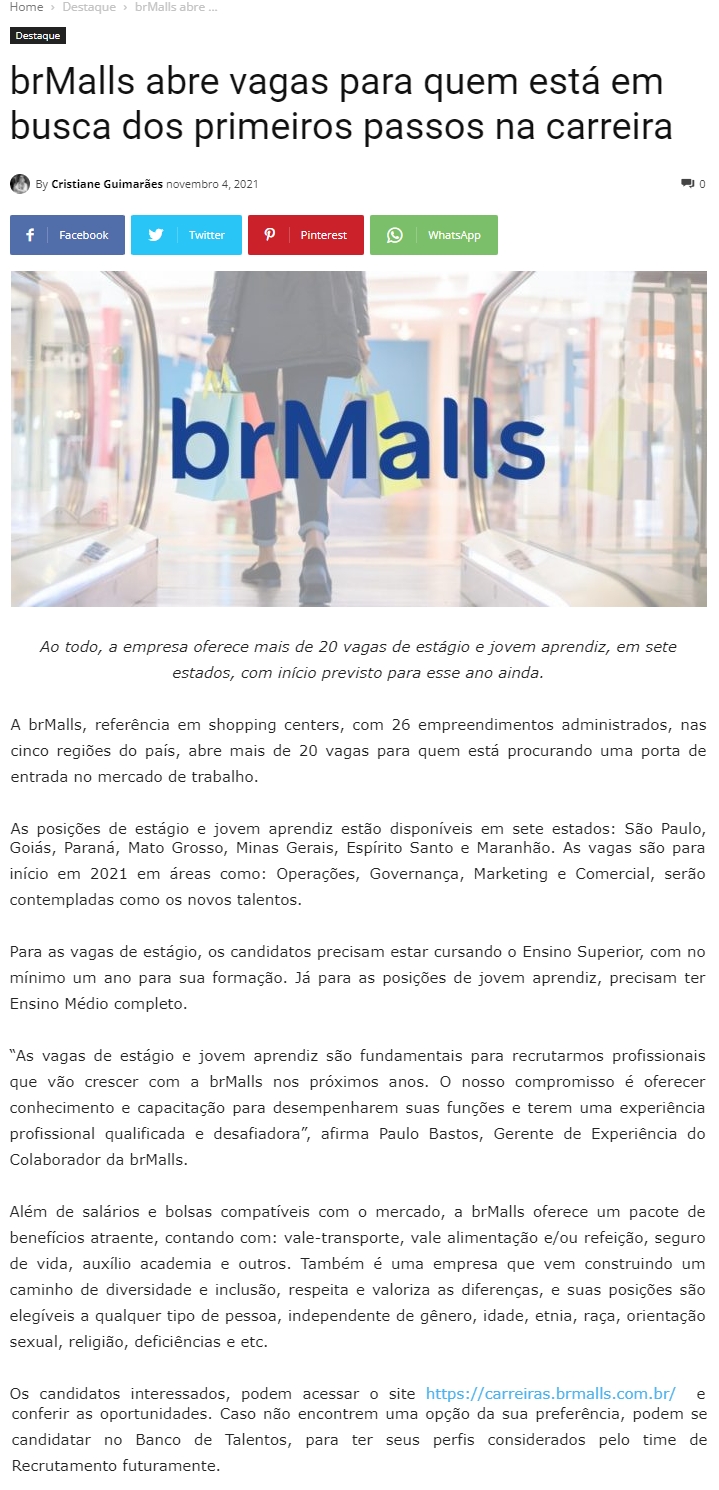 ONLINE-brMalls abre vagas para quem está em busca dos primeiros passos na carreira - 04.11