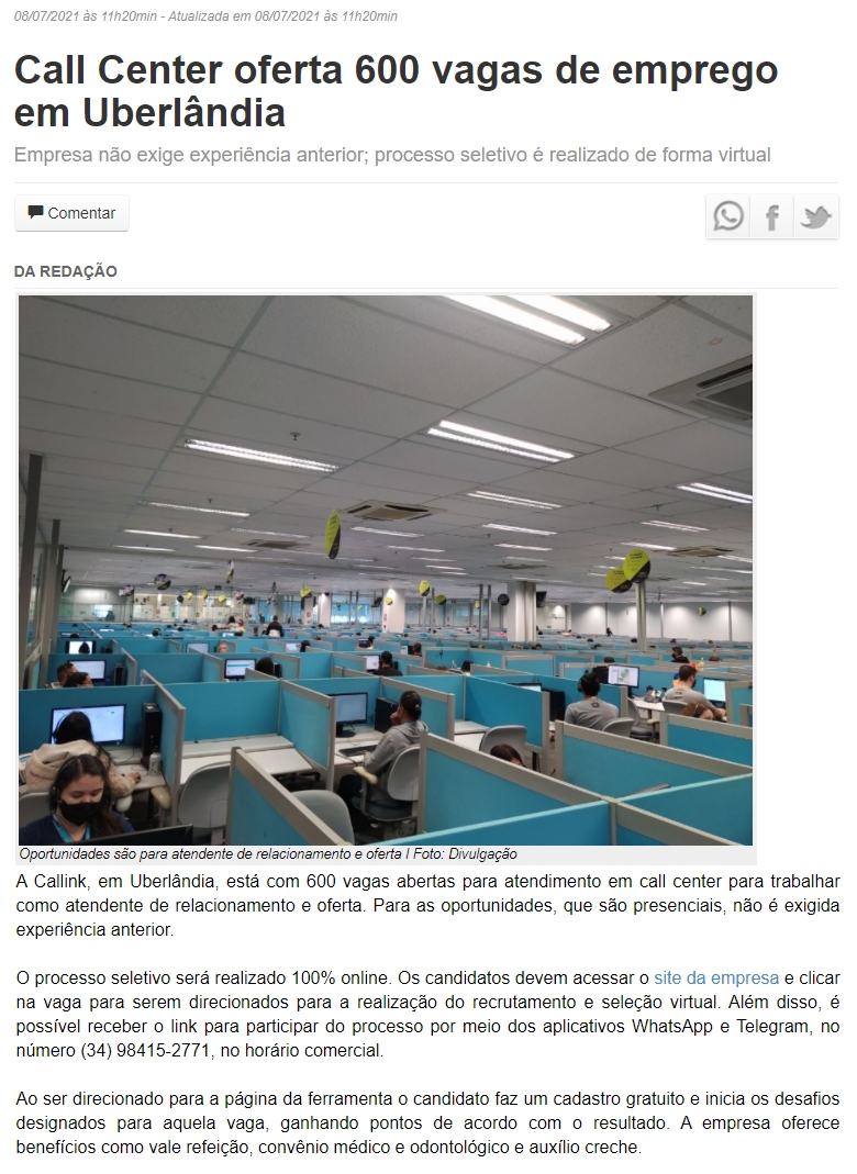 ONLINE - Call Center oferta 600 vagas de emprego em Uberlândia - 08.07