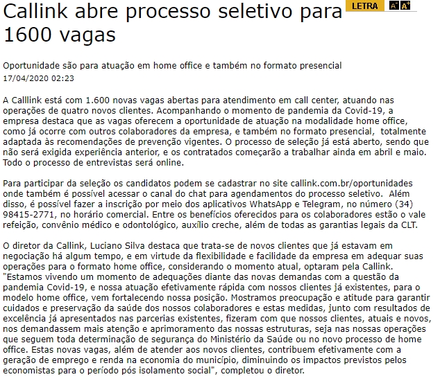 ONLINE - Callink abre processo seletivo para 1.600 vagas - (17/04)