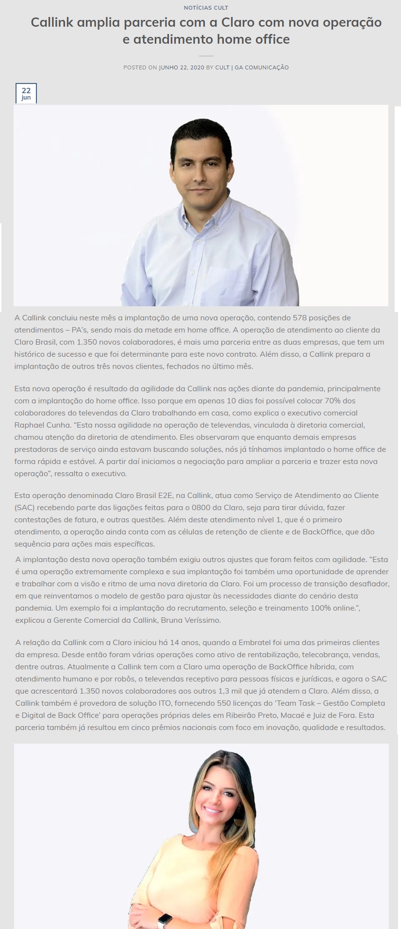 ONLINE - Callink amplia parceria com a Claro com nova operação e atendimento home office - (22/06)