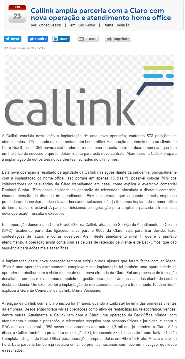 ONLINE - Callink amplia parceria com a Claro com nova operação e atendimento home office - (23/06)
