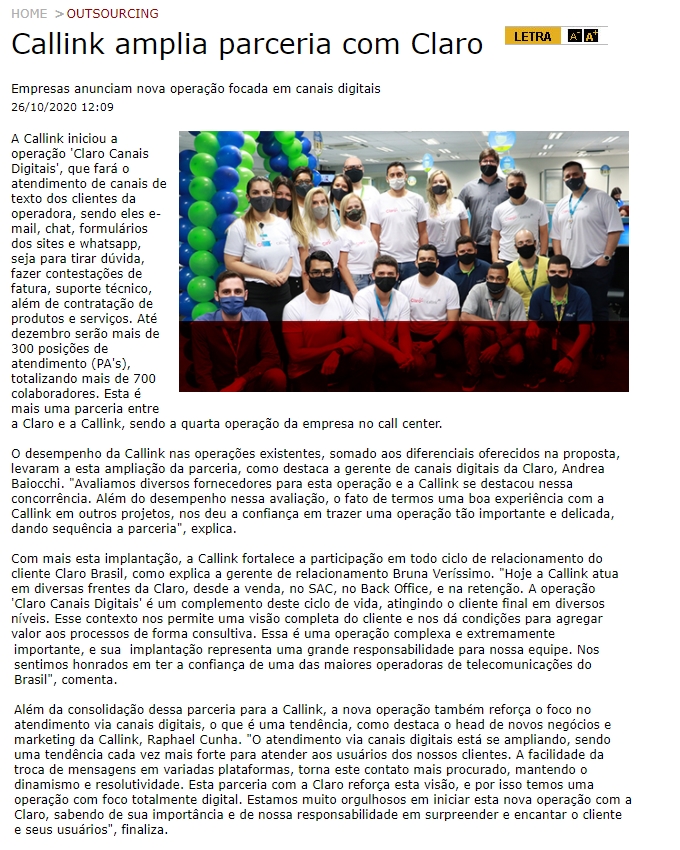 ONLINE - Callink amplia parceria com Claro- 26/10