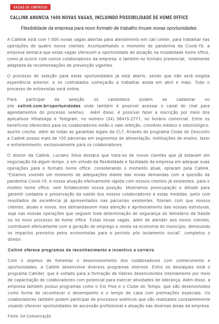 ONLINE - Callink anuncia 1600 novas vagas, incluindo possibilidade de home office - (17/04)