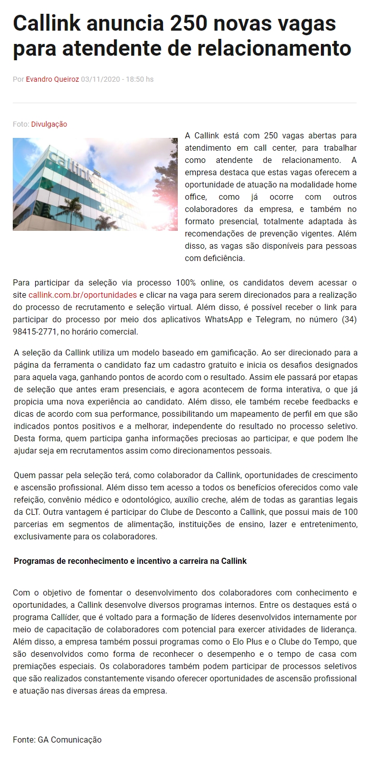 ONLINE - Callink anuncia 250 novas vagas para atendente de relacionamento - 03/11