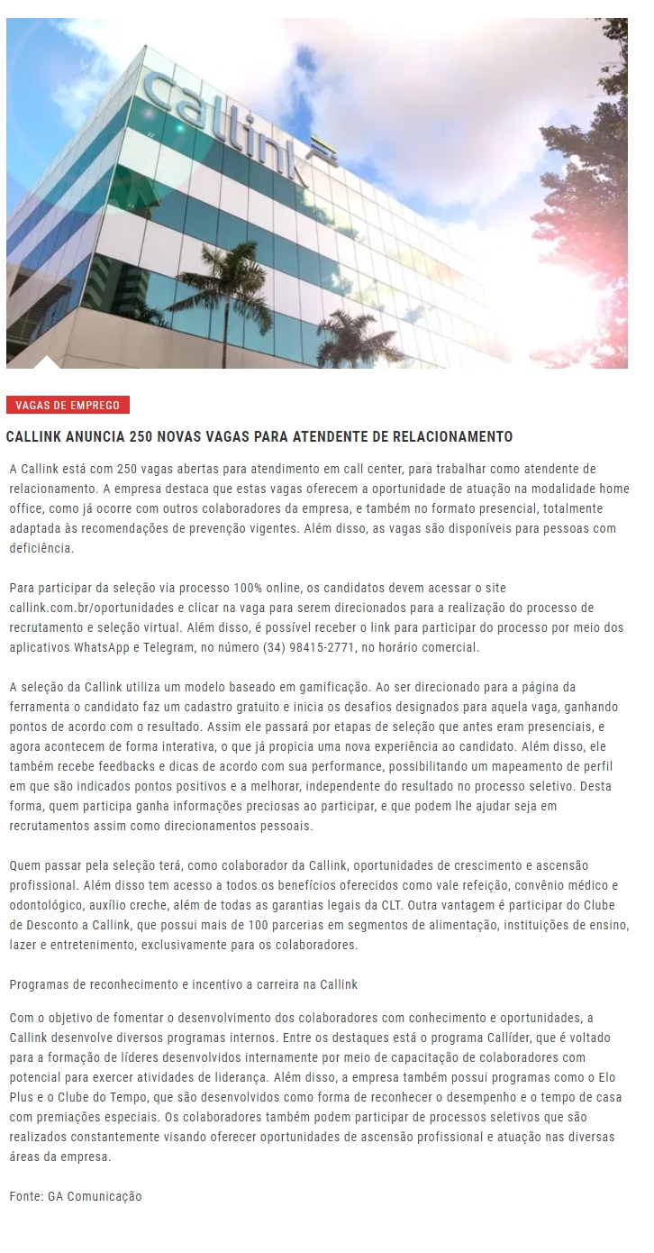 ONLINE - Callink anuncia 250 novas vagas para atendente de relacionamento - 05/11