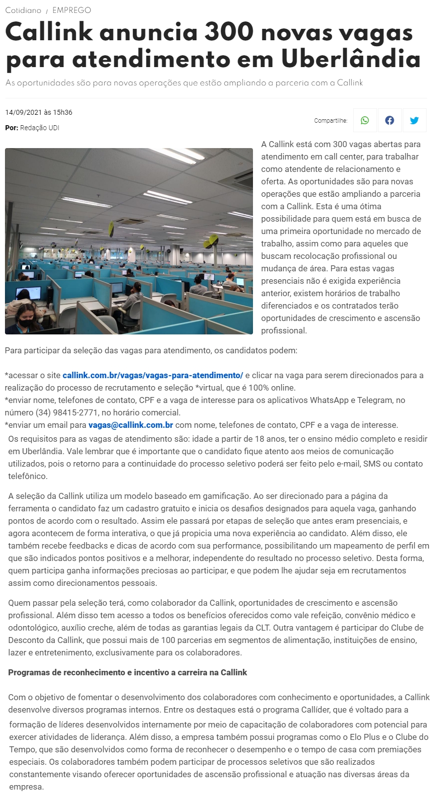 ONLINE - Callink anuncia 300 novas vagas para atendimento em Uberlāndia - 14.09