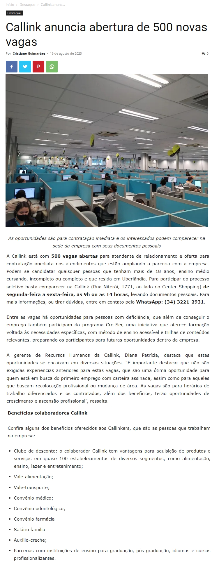 ONLINE-Callink anuncia abertura de 500 novas vagas-16.08
