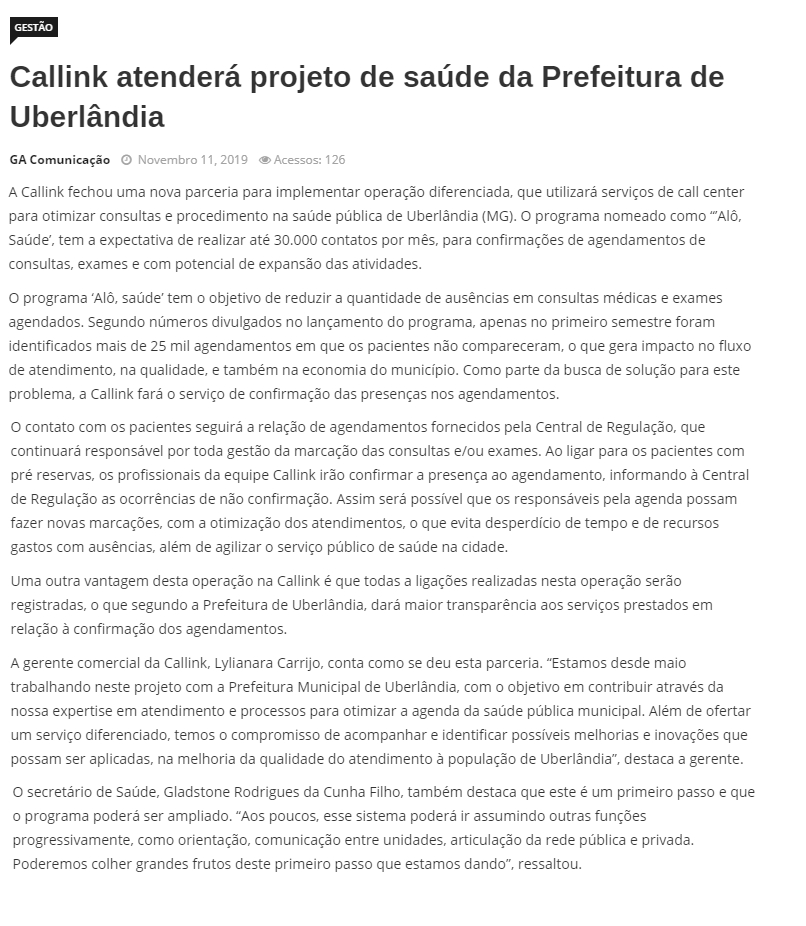 ONLINE - Callink atenderá projeto de saúde da Prefeitura de Uberlândia - (11/11)