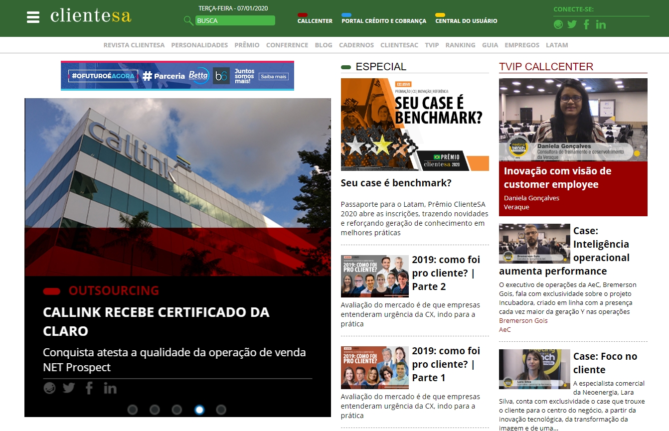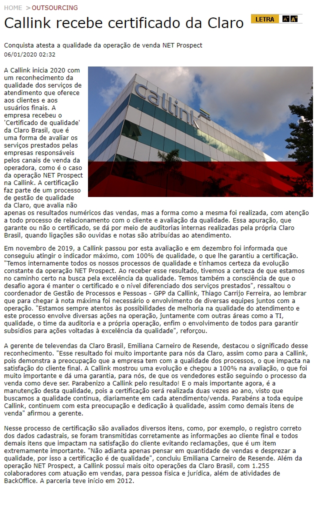 ONLINE - Callink conquista 'Certificado de qualidade' da Claro - (06/01)