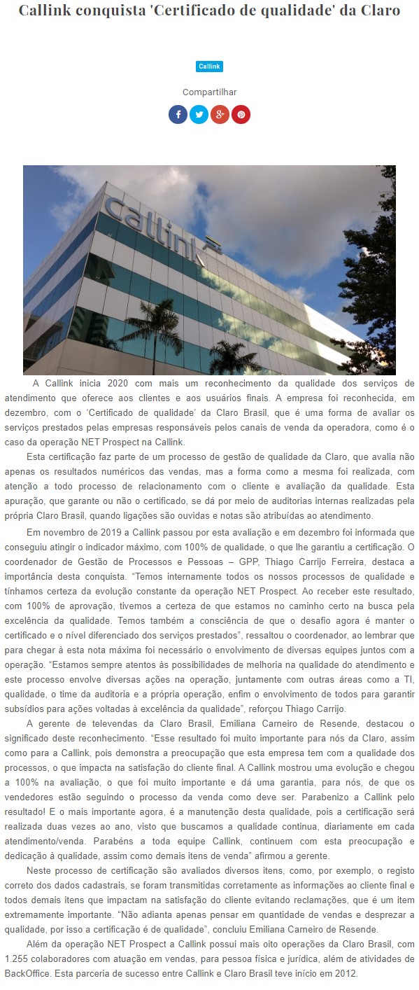 ONLINE - Callink conquista 'Certificado de qualidade' da Claro - 07/01