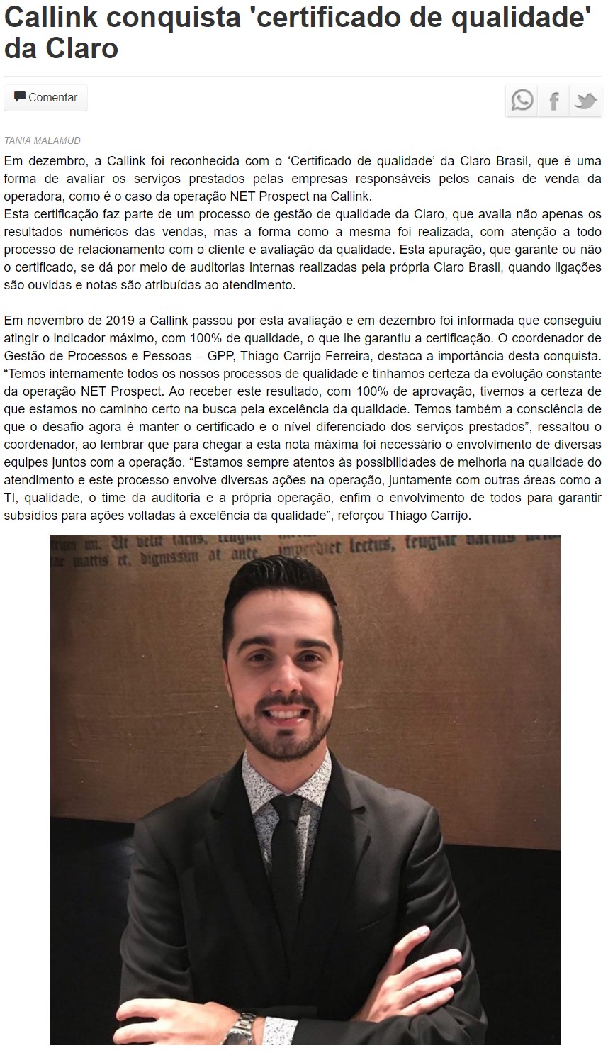 ONLINE - Callink conquista 'certificado de qualidade' da Claro - 12/01