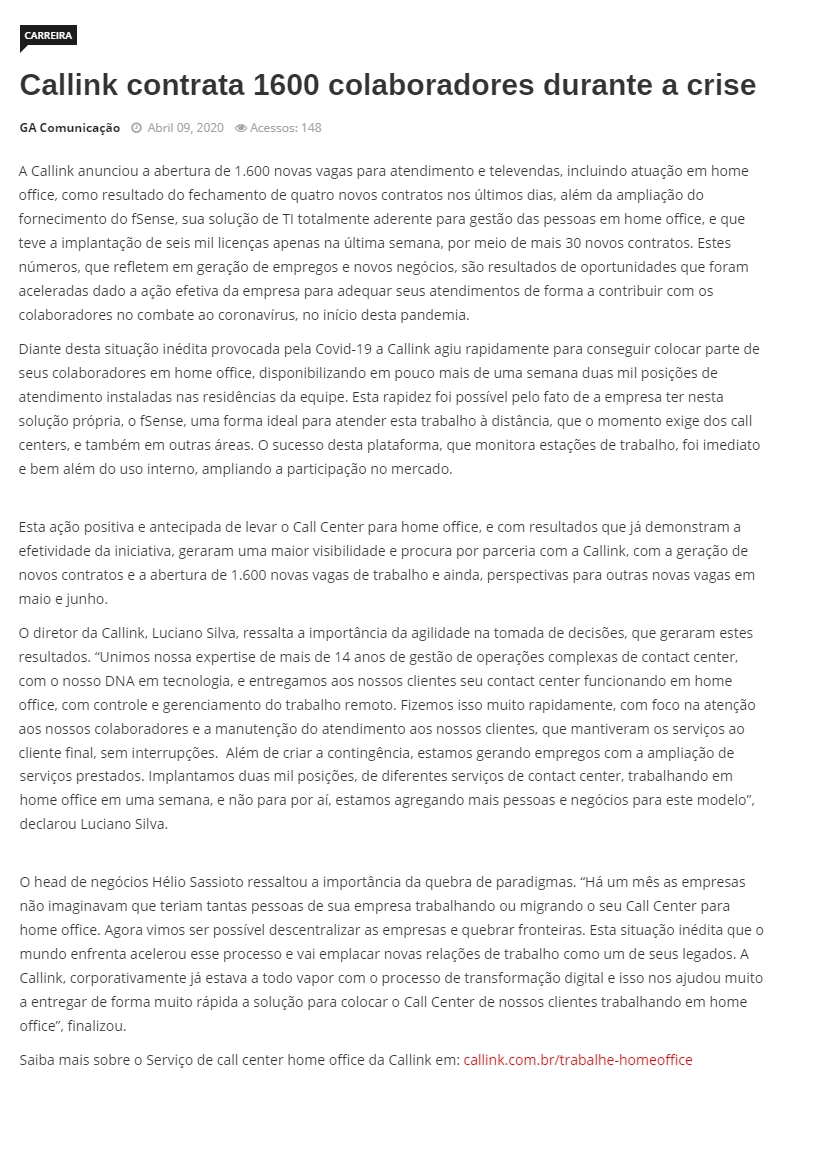 ONLINE - Callink contrata 1.600 novos colaboradores durante crise - (09/04)