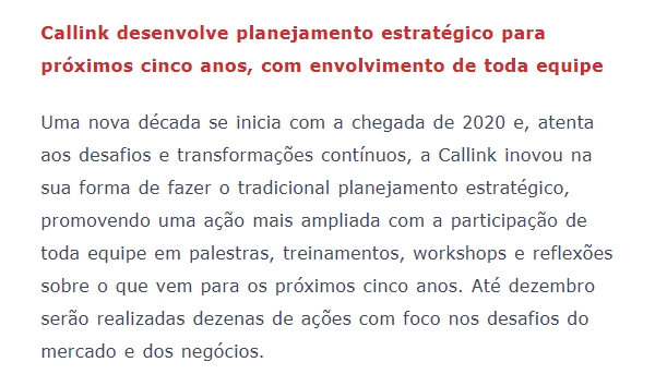 ONLINE - Callink desenvolve planejamento estratégico para próximos cinco anos, com envolvimento de toda equipe- (20/11)