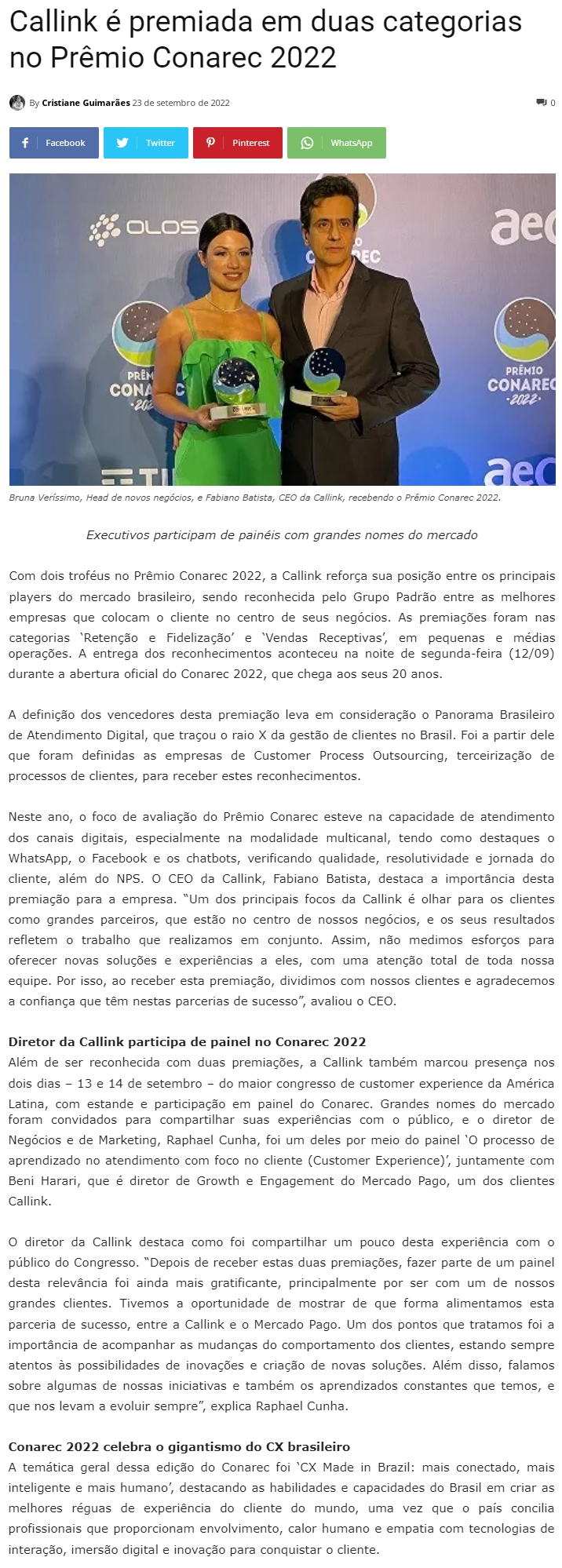 ONLINE - Callink é premiada em duas categorias no Prêmio Conarec 2022 - 23.09