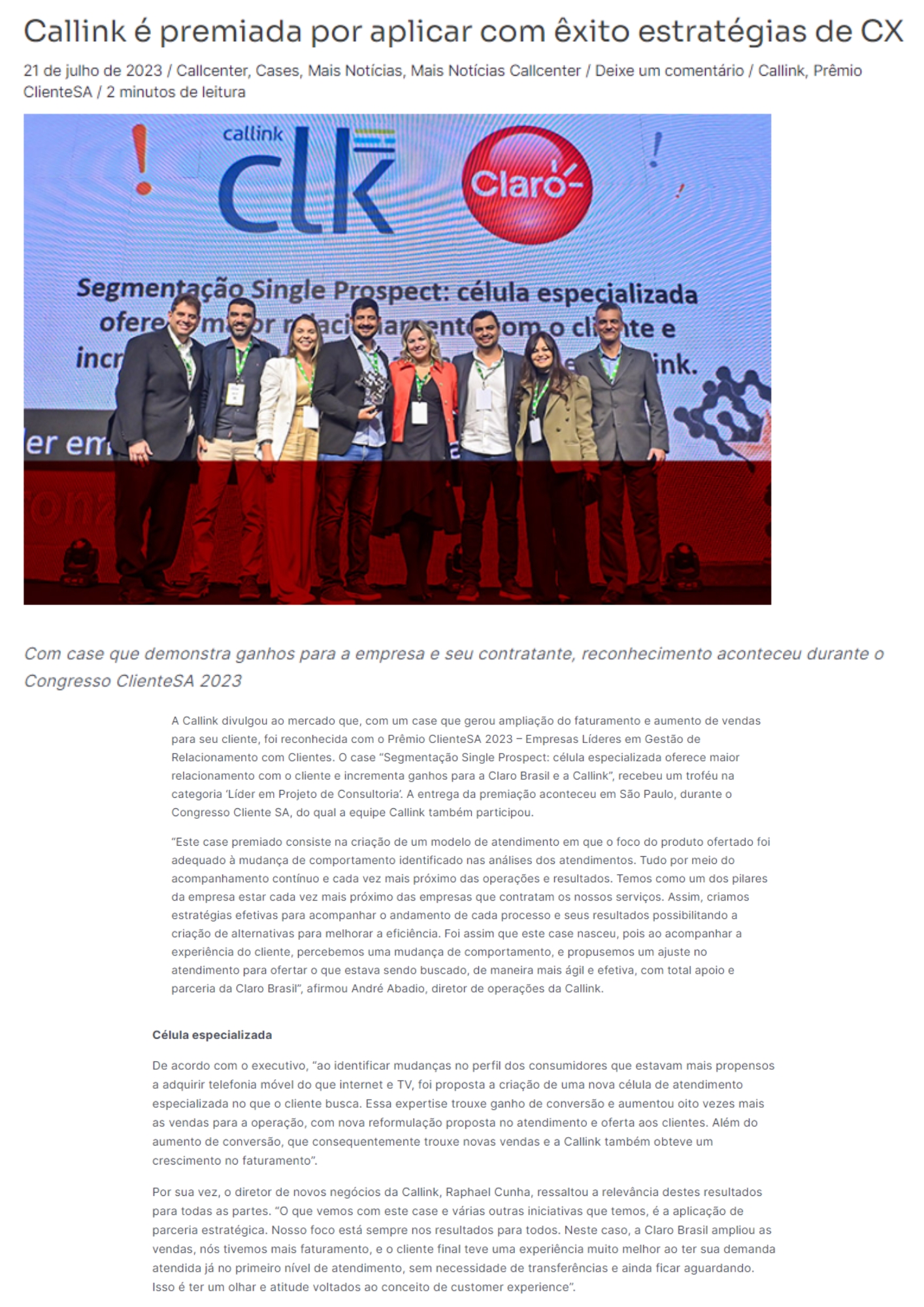 ONLINE - Callink é premiada por case em que aplica o Customer Experience - 21.07