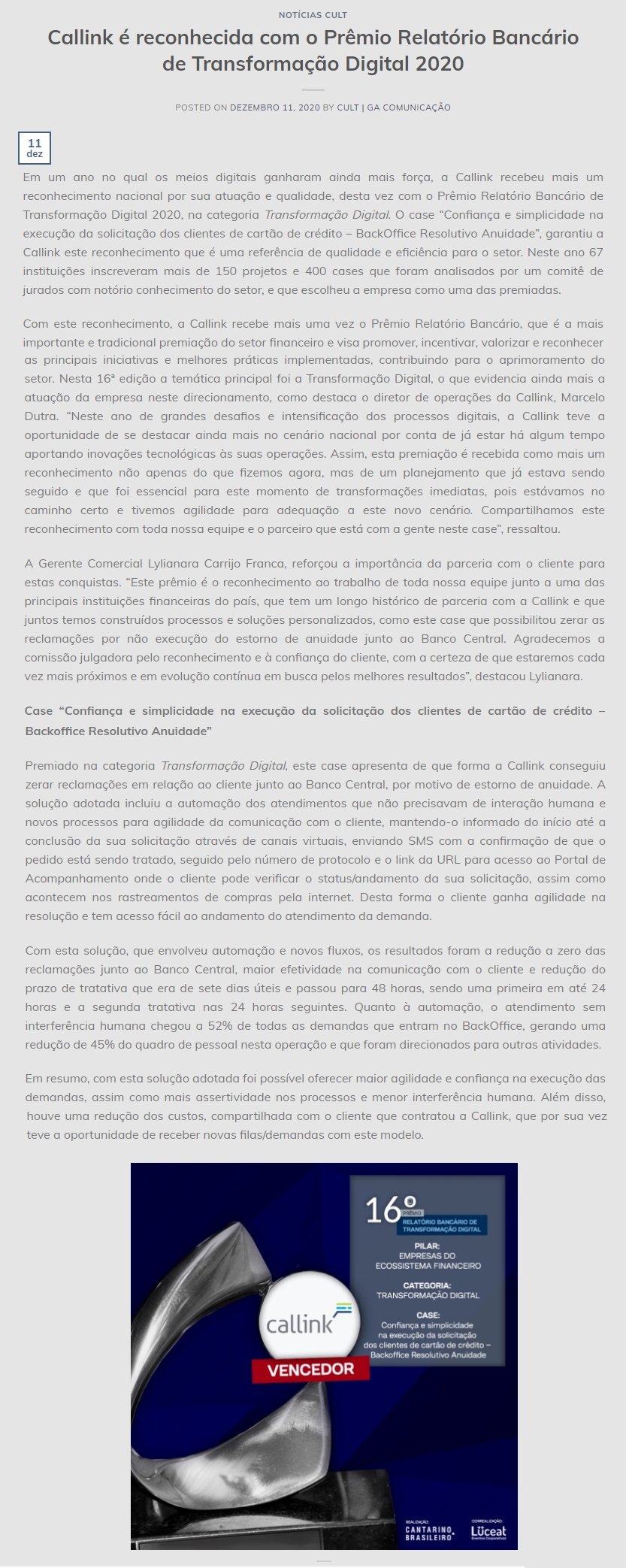 ONLINE - Callink é reconhecida com o Prêmio Relatório Bancário de Transformação Digital 2020 - 11/12