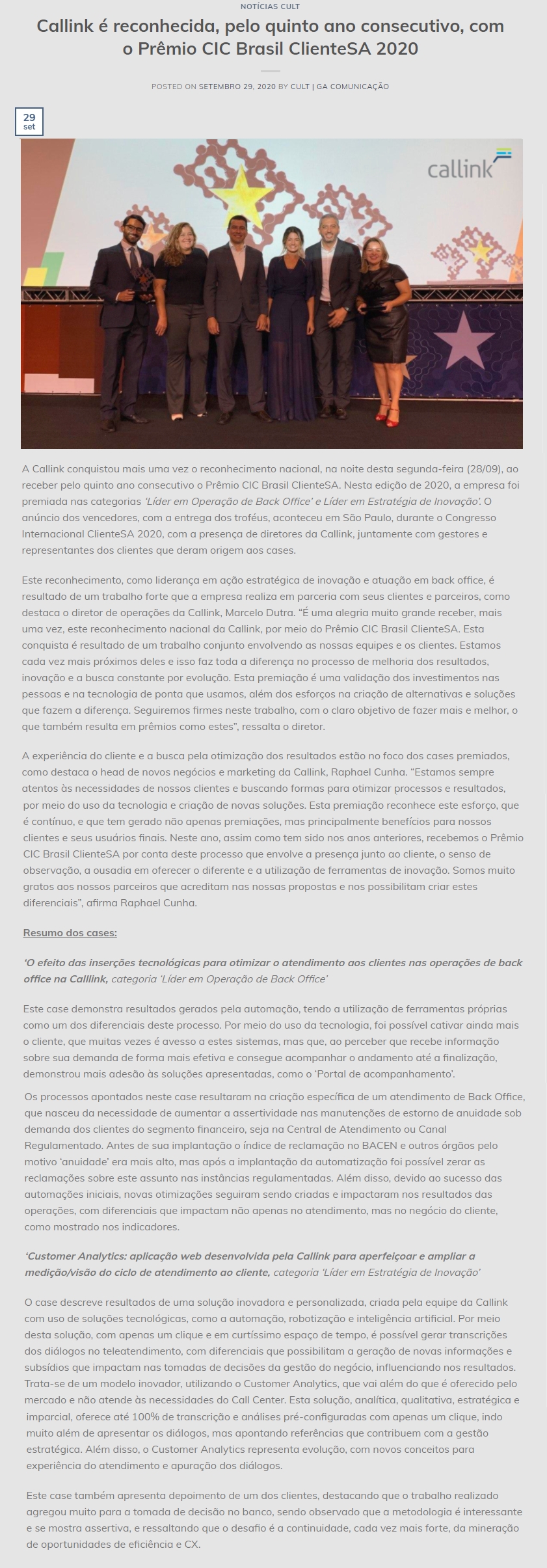 ONLINE - Callink é reconhecida, pelo quinto ano consecutivo, com o Prêmio CIC Brasil ClienteSA 2020 - 29.09