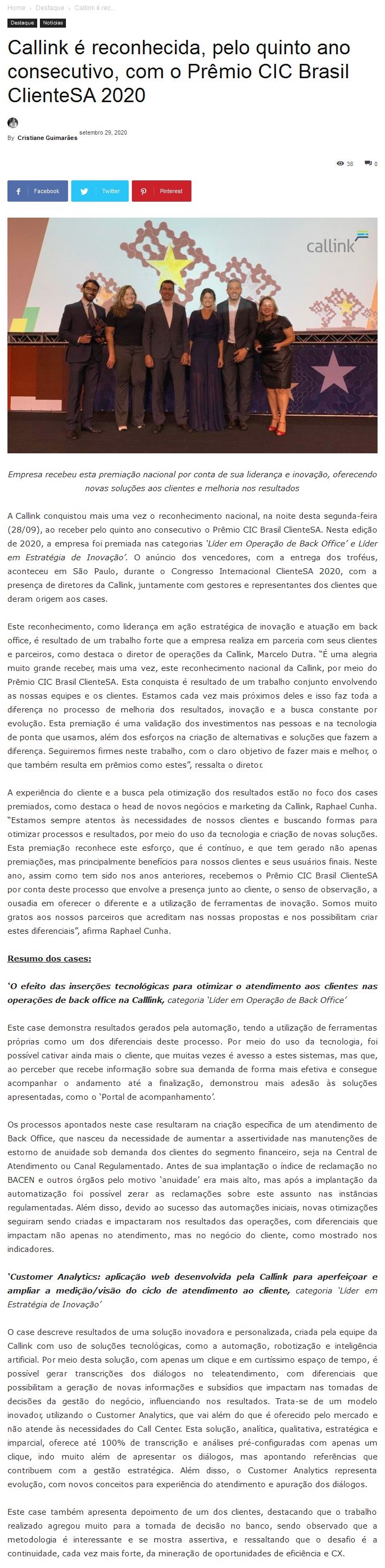 ONLINE - Callink é reconhecida, pelo quinto ano consecutivo, com o Prêmio CIC Brasil ClienteSA 2020 - 29/09