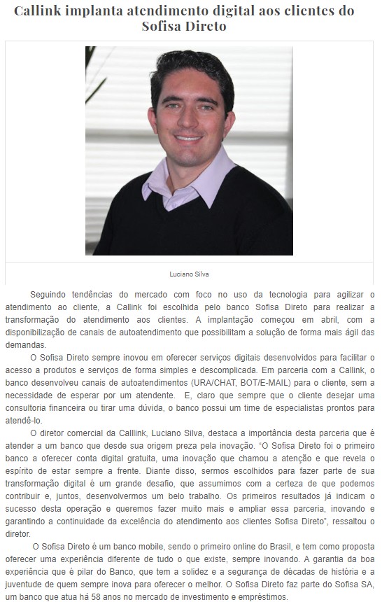 ONLINE - Callink implanta atendimento digital aos clientes do Sofisa Direto (23/09)