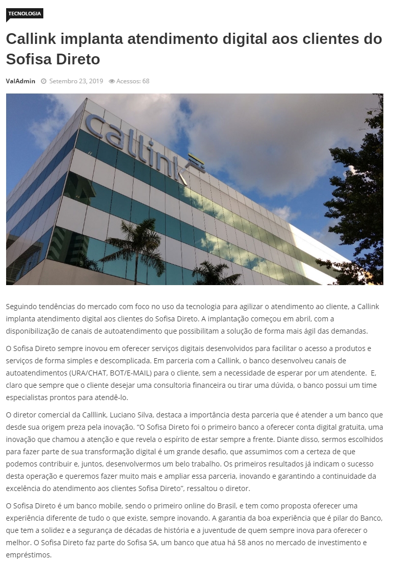 ONLINE - Callink implanta atendimento digital aos clientes do Sofisa Direto - Callink - (23/09)