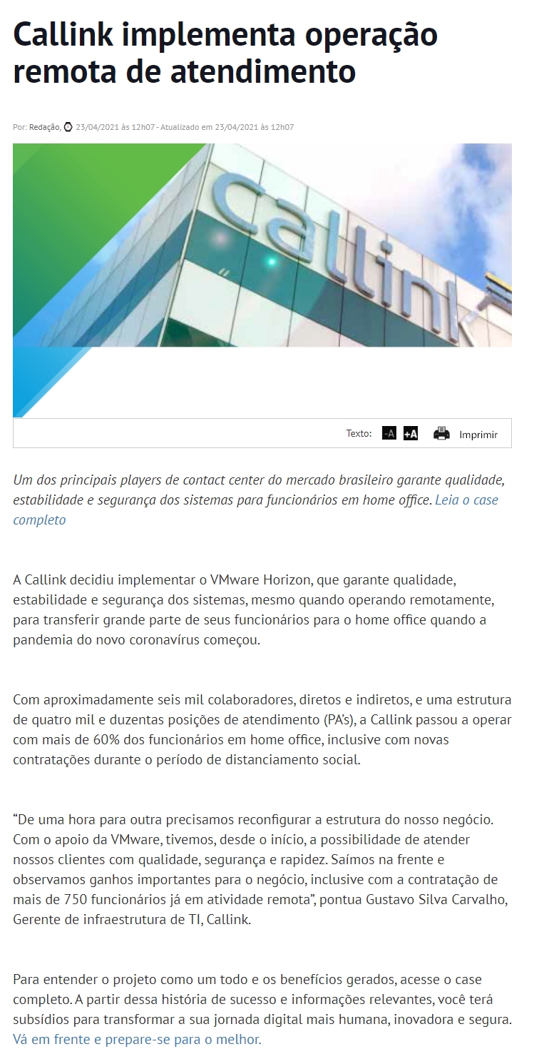 ONLINE - Callink implementa operação remota de atendimento - 23.04