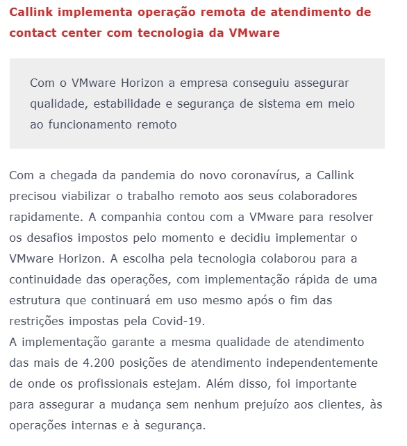 ONLINE - Callink implementa operação remota de atendimento de contact center com tecnologia da VMware - 08.02