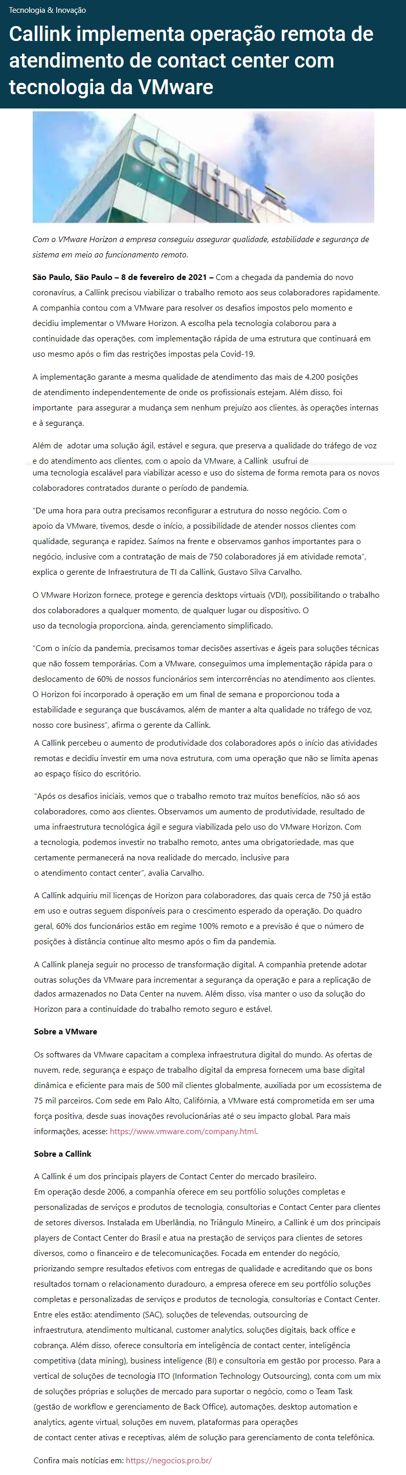ONLINE - Callink implementa operação remota de atendimento de contact center com tecnologia da VMware - 08.02