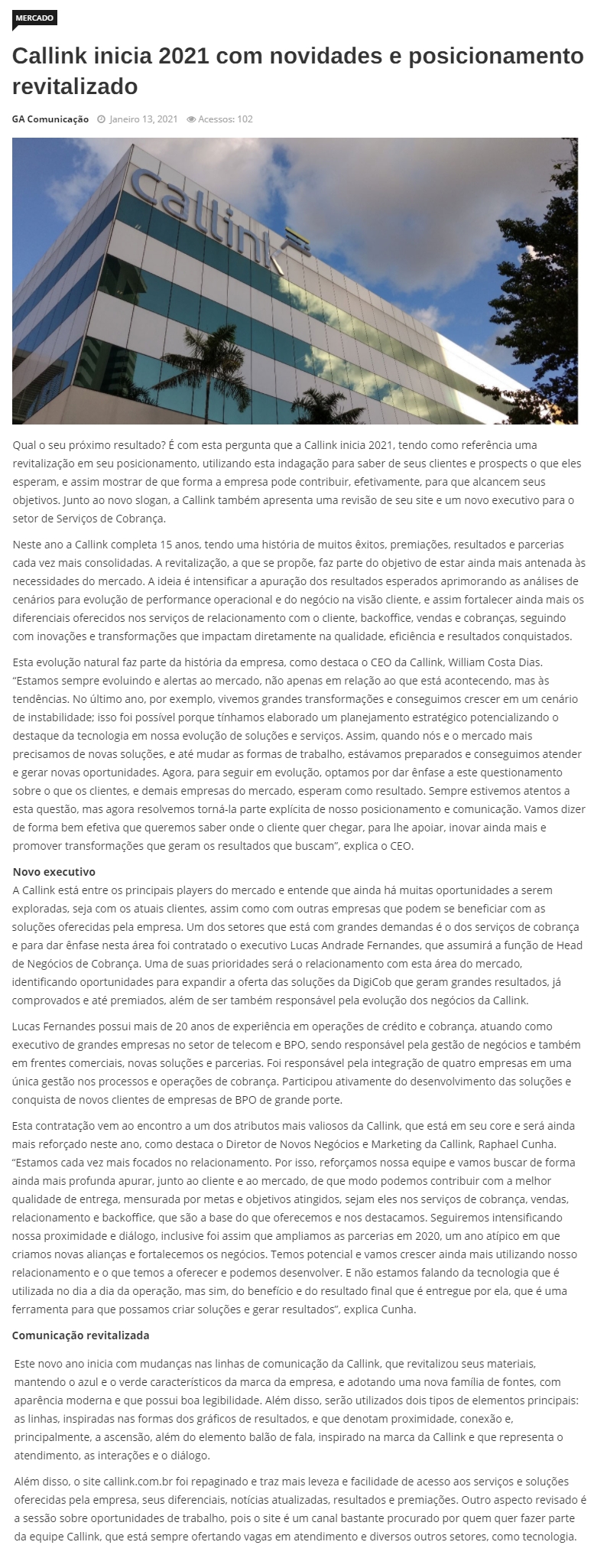 ONLINE - Callink inicia 2021 com novidades e posicionamento revitalizado - 13/01