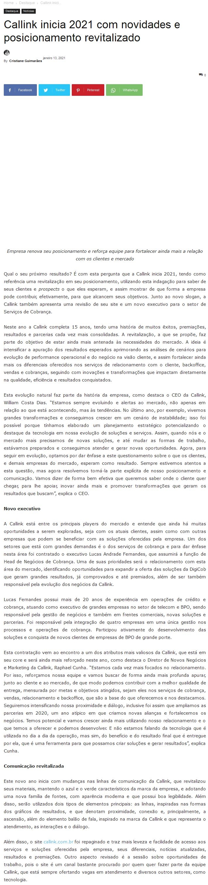 ONLINE - Callink inicia 2021 com novidades e posicionamento revitalizado - 13/01